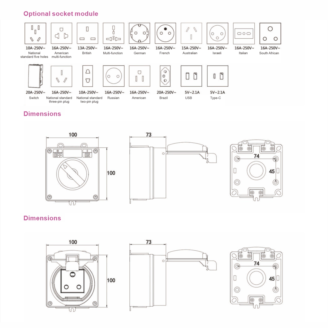 Multiple interchangeable socket modules including UK type (13A) , Eu type (schuko),France type, US type, Israel type, Australia type, etc.
