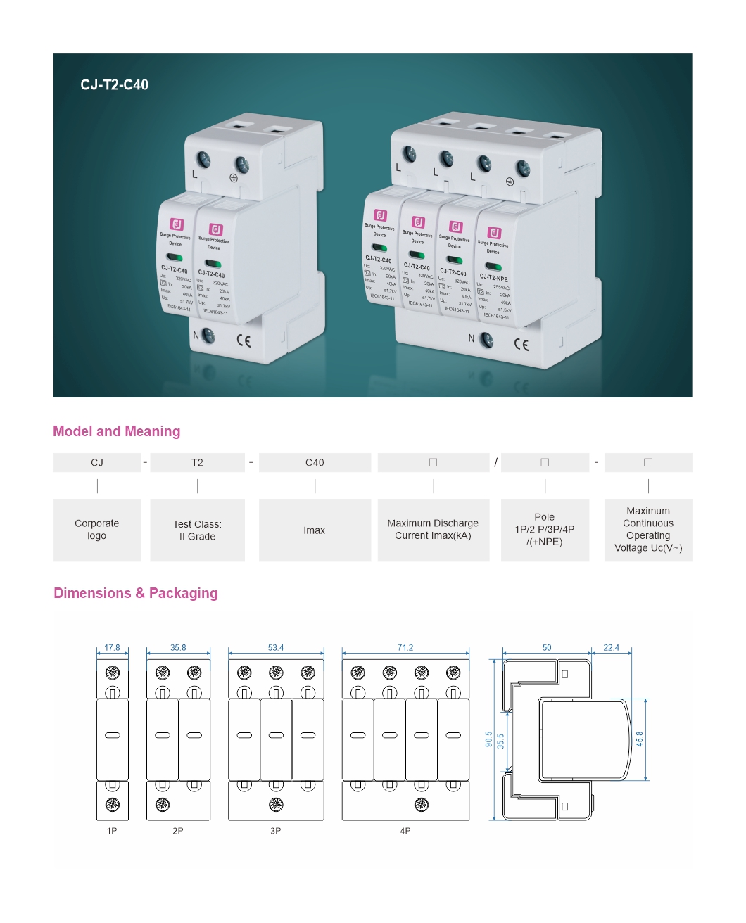 CJ-T2-C40 series surge protective device applied in C grade lightning-proof,installed on the joint of LPZ1 or LPZ2 and LPZ3,usually installed in household distrbution boards,computer eauipment,information equipment,electronic equipment and in the socket box in front of control equipment or near the control equipment.