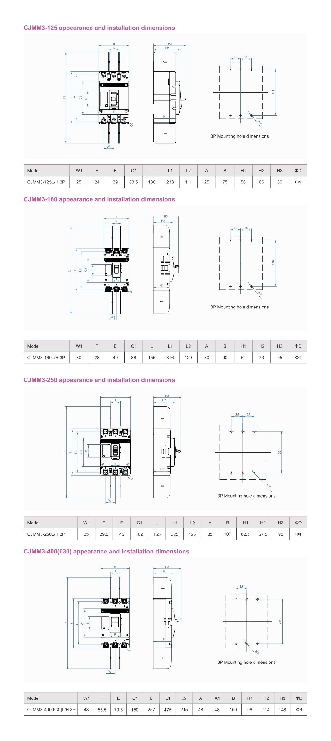 - Breaking capacity: Covers commonly used breaks in the power distribution field: 20kA, 36kA, 50kA, 70kA, 75kA (see the parameter table for specific breaking of each frame)