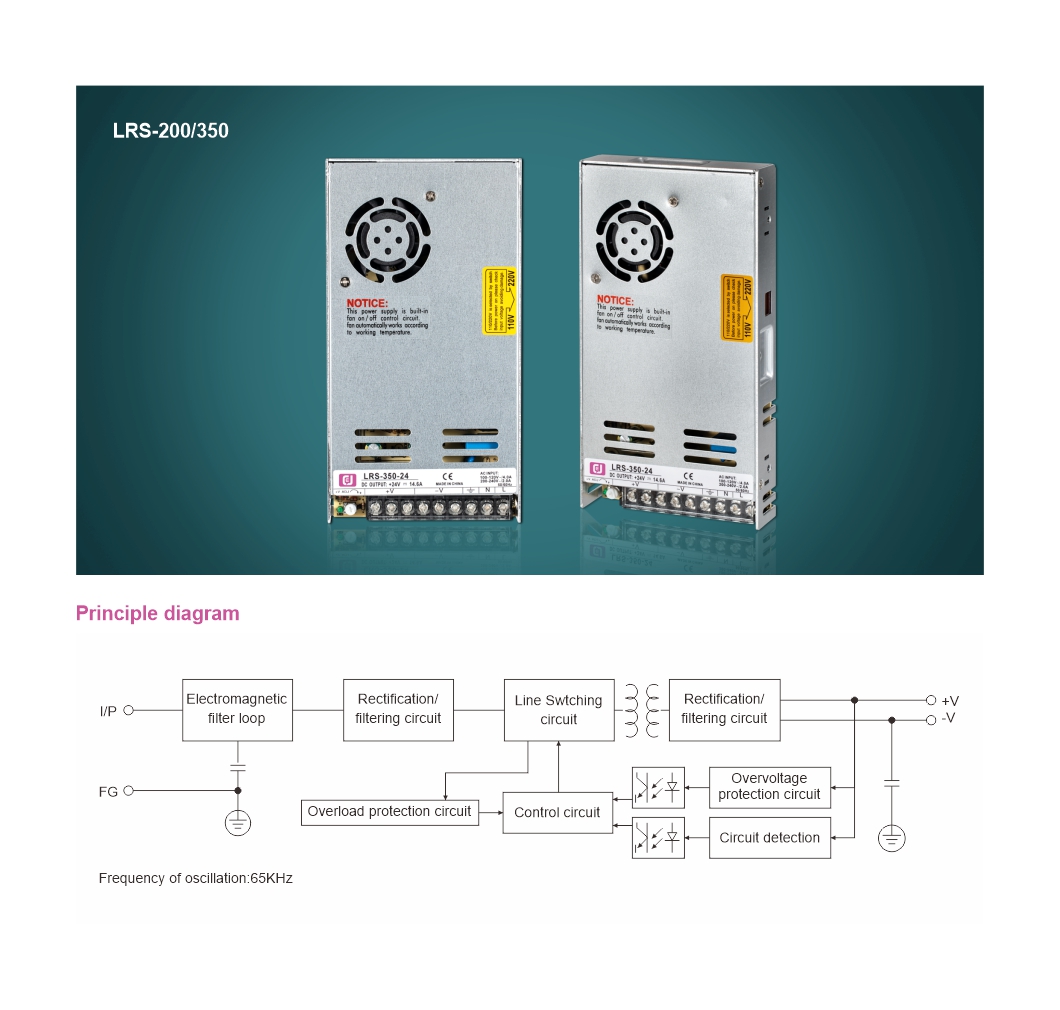 LRS-200,350 series is a 200,350W single-group output sealed power supply, with a 30mm low-profle design, using 85~264VAC full range ac input whole series to provide 5V,12V,15V,24V,36V and 48V output.